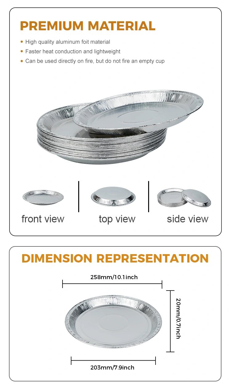 யுனஞ்சு அலுமினியத் தகடு மாதிரி எண் 13110 உடன் 10 அங்குல பீஸ்ஸா பான் சில்வர் அலுமினியத் தகடு கொள்கலன்களை வழங்குகிறது. தயாரிப்பு 258 மிமீ (சுமார் 10.1 அங்குலங்கள்) மேல் விட்டம், 203 மிமீ (சுமார் 7.9 அங்குலங்கள்) குறைந்த விட்டம், மற்றும் 20 மிமீ (சுமார் 0.7 அங்குலங்கள்) உயரத்தில் உள்ளது. ஏறக்குறைய 695 மில்லி (சுமார் 24.5 அவுன்ஸ்) திறனுடன், இது ஒட்டிக்கொள்ளாமல் பீட்சாவை சுடுவதற்கு ஏற்றது, அச்சுகளிலிருந்து விடுவிக்க எளிதானது, மற்றும் துர்நாற்றம் இல்லை. கூடுதலாக, அதன் உயர்த்தப்பட்ட விளிம்பு வடிவமைப்பு பொருட்களை கொட்டுவதைத் தடுக்கிறது மற்றும் நடைமுறையை அதிகரிக்கிறது. உங்கள் வாடிக்கையாளர்களின் தோற்றத்தை ஆழப்படுத்தவும், உங்கள் பிராண்ட் விழிப்புணர்வை மேம்படுத்தவும் உதவும் லோகோ தனிப்பயனாக்குதல் சேவைகளையும் நாங்கள் வழங்க முடியும்.