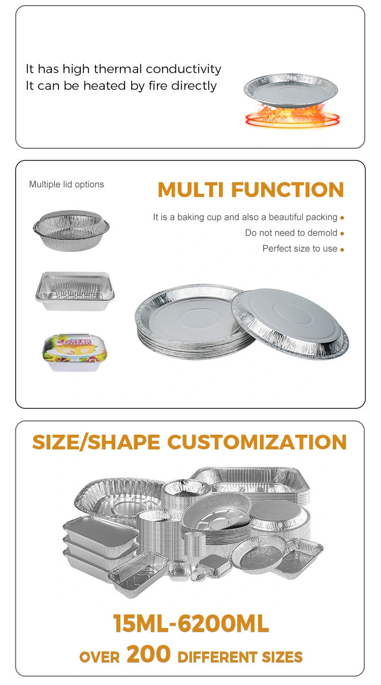 இந்த தயாரிப்பின் ட்ரெப்சாய்டல் வடிவம் அழகியலைச் சேர்ப்பது மட்டுமல்லாமல், அடுக்கவும் சேமிக்கவும் எளிதாக்குகிறது, சேமிப்பக இடத்தை திறம்பட சேமிக்கிறது. அதே நேரத்தில், இந்த வடிவமைப்பு பொருட்களை எடுத்துக்கொள்வது மிகவும் வசதியானது, மேலும் காடுகளில் இருக்கும்போது அது எளிதில் நழுவாது, இது பயன்பாட்டின் பாதுகாப்பை பெரிதும் மேம்படுத்துகிறது. கூடுதலாக, 10 அங்குல பிஸ்ஸா பான் சில்வர் அலுமினியத் தகடு கொள்கலன் இலகுரக வடிவமைப்பைக் கொண்டுள்ளது, இது வெளிப்புற பிக்னிக்ஸுக்கு ஏற்றது. எப்போது வேண்டுமானாலும், எங்கும் உங்களுடன் எடுத்துச் செல்லலாம், வீட்டிலோ அல்லது வெளிப்புறத்திலோ இருந்தாலும் எந்த சந்தர்ப்பத்தையும் எளிதாக சமாளிக்கலாம்.