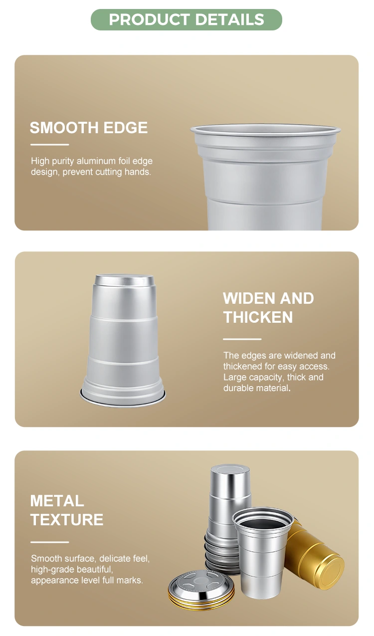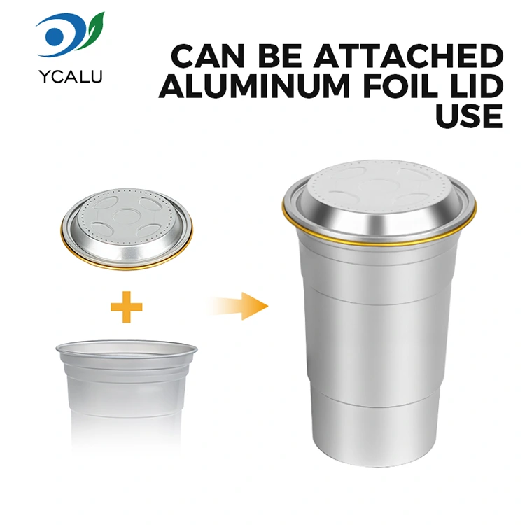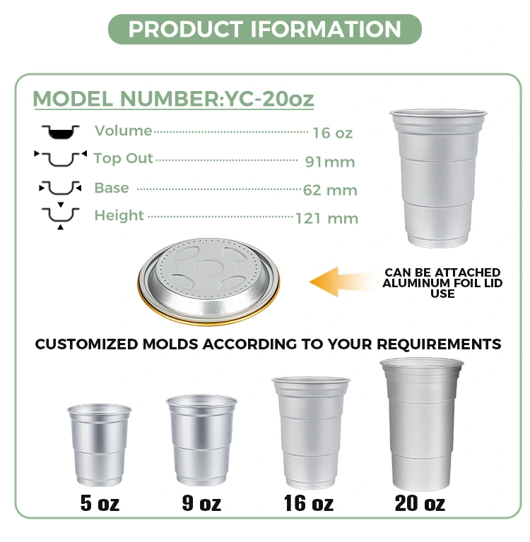 யுஞ்சு ஒரு முன்னணி சீனா 16oz டிஸ்போசபிள் தனிப்பயன் அலுமினிய ஃபாயில் பானம் கப் உற்பத்தியாளர். இந்த 16oz டிஸ்போசபிள் கஸ்டம் அலுமினிய ஃபாயில் டிரிங்க்கிங் கப், காபி மற்றும் பீர் போன்ற நிலையான பானங்களுக்கு ஏற்ற 460-மில்லி அலுமினிய ஃபாயில் கோப்பை ஆகும். இது ஒரு தரப்படுத்தப்பட்ட வடிவமைப்பைக் கொண்டுள்ளது மற்றும் அடிக்கடி தனிப்பயனாக்குதல் தேவைகளைக் கொண்ட காபி கடைகள் மற்றும் கிராஃப்ட் பார்கள் போன்ற வணிகப் பயனர்களை இலக்காகக் கொண்டுள்ளது. திறமையான வெப்ப கடத்துத்திறன் மற்றும் அடிப்படை சீலிங் செயல்திறனை வழங்கும் அதே வேளையில், இந்த 16oz டிஸ்போசபிள் கஸ்டம் மறுசுழற்சி செய்யக்கூடிய அலுமினிய ஃபாயில் டிரிங்க் கோப்பை விரைவான மற்றும் நெகிழ்வான பிராண்ட் காட்சி தனிப்பயனாக்குதல் சேவைகளுக்கு அதிக முக்கியத்துவம் அளிக்கிறது.