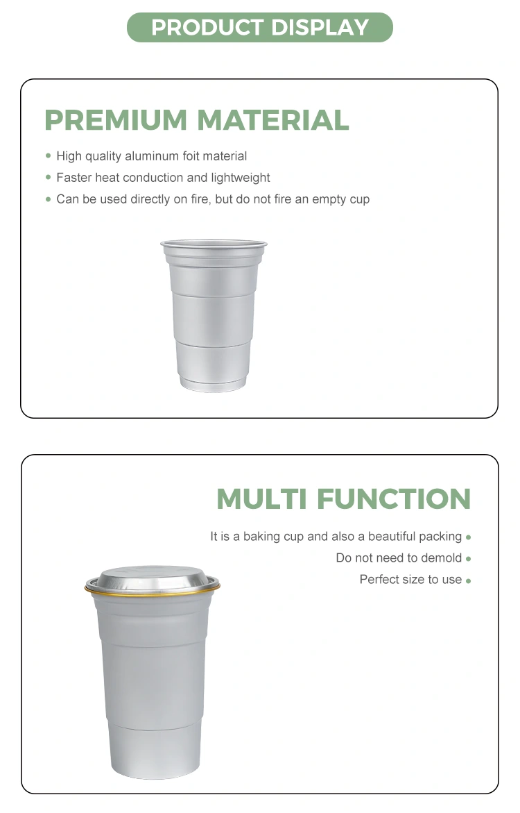 சூடான பானங்களை சேமிக்கவும் இதைப் பயன்படுத்தலாம். 16oz டிஸ்போசபிள் கஸ்டம் அலுமினியம் ஃபாயில் ஹாட் டிரிங்க் கோப்பையே சூடாக்க அடுப்பில் வைக்கலாம் அல்லது கேம்ப்ஃபயரில் (வெற்றுக் கோப்பையுடன் நேரடியாகத் தொடர்பைத் தவிர்க்கவும்) உள்ளடக்கங்களை சூடாக்க வைக்கலாம்.