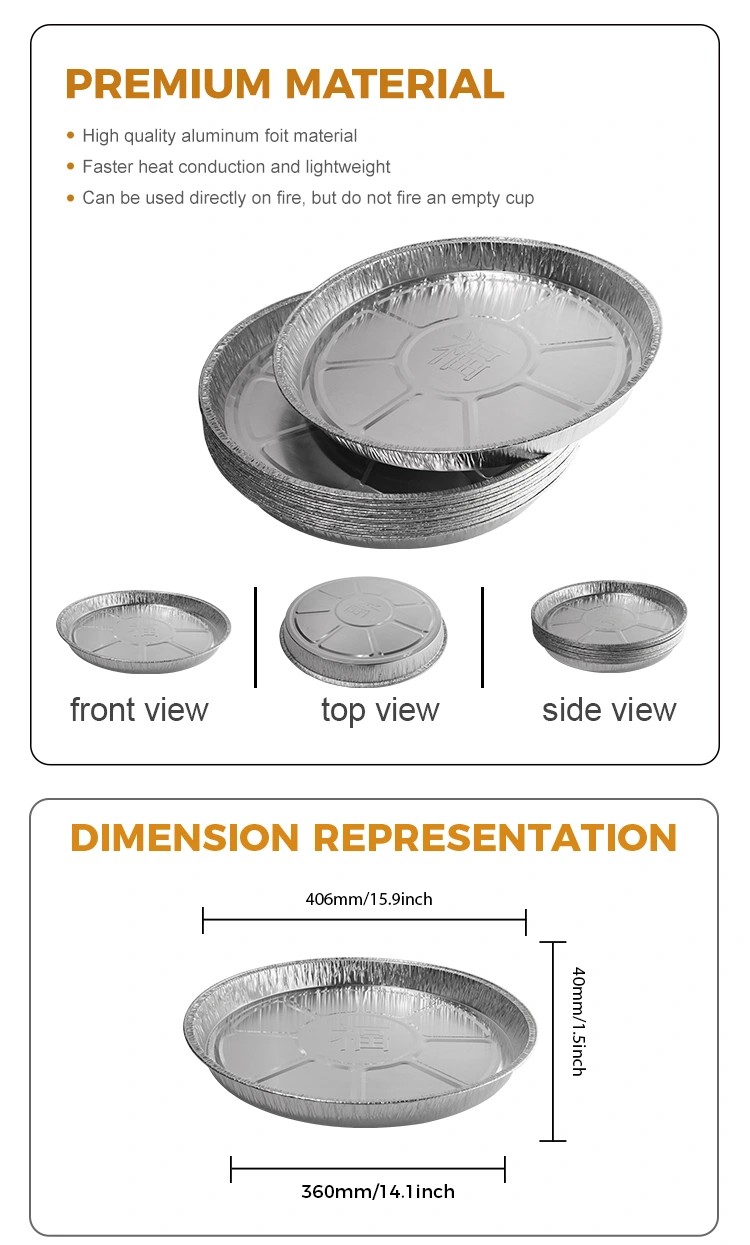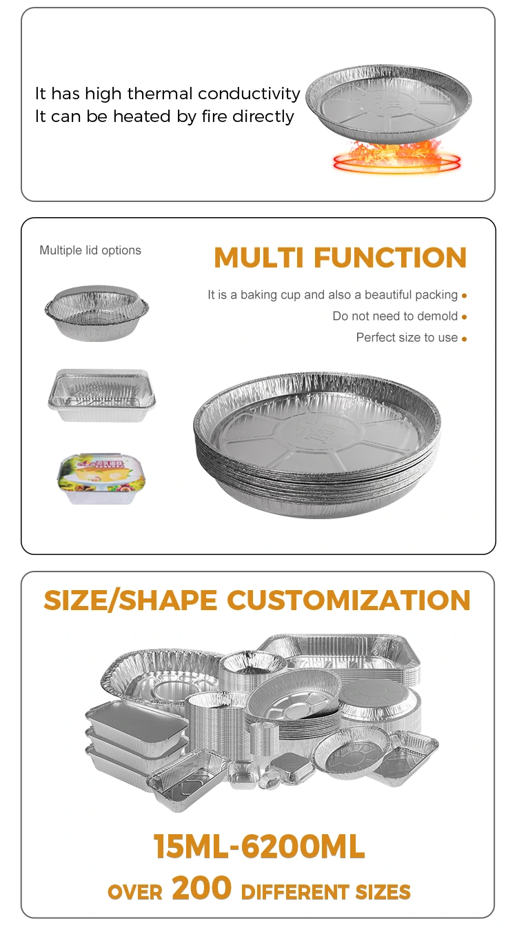 Yunchu அலுமினியத் தகடு சப்ளையர் மாதிரி YR3700 செலவழிப்பு ஏர் பிரையர் அடுப்பு வெள்ளி அலுமினியத் தகடு உணவு கொள்கலன் வழங்கப்படுகிறது. கொள்கலன் மேலே 406 மிமீ (சுமார் 15.9 அங்குலங்கள்) விட்டம், கீழே 360 மிமீ (சுமார் 14.1 அங்குலங்கள்) விட்டம், 40 மிமீ (சுமார் 1.5 அங்குலங்கள்), மற்றும் சுமார் 3,700 மில்லி (சுமார் 130.5 அவுன்ஸ்) திறன் கொண்டது. திறந்த சுடர் நீராவி வசதியானது மற்றும் சுகாதாரமானது, அடுப்பு பேக்கிங், உயர் வெப்பநிலை எதிர்ப்பு 400 ° C எரிக்கப்படவில்லை அல்லது உடைக்கப்படவில்லை, அடுப்பு பேக்கிங் ஒட்டும் அல்ல, க்ரீஸ் மற்றும் வேண்டுமென்றே பார்பிக்யூவுக்கு பயப்படாது, திறந்த தீப்பிழம்புகளை நேரடியாக தொடர்பு கொள்ளும் திறன் காரணமாக, பயனர்கள் பாதுகாப்பு சிக்கல்களைப் பற்றி கவலைப்பட தேவையில்லை. அலுமினியத் தகடு கொள்கலன்கள் அதிக வெப்பநிலையை எதிர்க்கின்றன, பேக்கிங்கிற்கு மிகவும் எதிர்க்கின்றன, மேலும் எரிக்கவோ உடைக்கவோ எளிதல்ல. முழு ரோலின் விளிம்பு எண்ணெய் இல்லாதது, உணவு பானையின் சுவரில் ஒட்டாமல் தடுக்கிறது, மேலும் பாதுகாப்பு மிகவும் நெருக்கமானது.