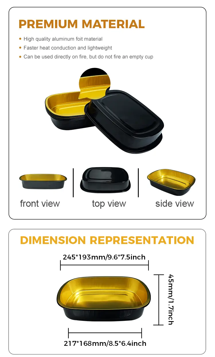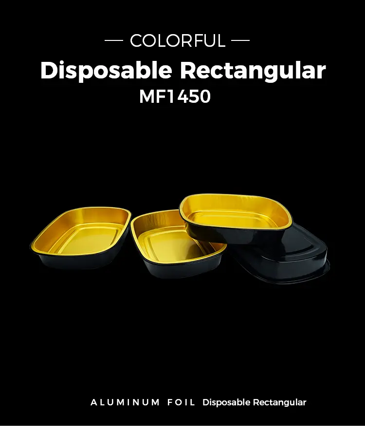 Yunchu aluminum foil supplier Disposable black gold baking tray Rectangular Aluminum Foil Containers MF1450 is suitable for large-scale catering, especially suitable for canteen catering, restaurant chain stores and refrigerated food distribution and other scenarios, this product is made of high-strength aluminum foil material, low height is suitable for some turkey, grilled fish, stewed and other ingredients of food to place, strong thermal conductivity can evenly அதிக வெப்பநிலையை சிதறடிக்கவும், உணவு சமமாக சூடாக இருப்பதை உறுதிசெய்யவும், நல்ல சுமை தாங்கும் திறன் மற்றும் சுருக்க செயல்திறனுடன், போக்குவரத்தின் போது வெளியேற்றப்படுவது மற்றும் சிதைப்பது எளிதல்ல என்பதை உறுதிப்படுத்த, படலம் வெப்ப முத்திரை அல்லது பிளாஸ்டிக் மூடி மூலம் பயன்படுத்தப்படலாம்.