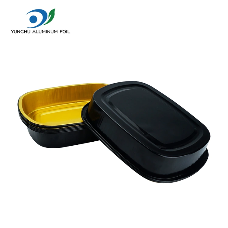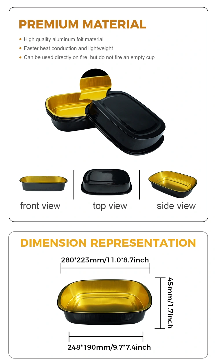 Yunchu Aluminum Foil Supplier Disposable black gold catering Rectangular Aluminum Foil Containers is suitable for large-volume catering and takeaway industries, especially suitable for baking, catering chains and self-service chains and other scenarios, the product is made of 8011 food-grade aluminum foil material, the height is low and suitable for some turkey, grilled fish, stew and other foods with many ingredients to place, can be அலுமினியத் தகடு சீல் மூடி மற்றும் செல்லப்பிராணி முழுமையாக வெளிப்படையான மூடி, சிறந்த சீல் செயல்திறன், அதிக வெப்பநிலை எதிர்ப்பு மற்றும் எண்ணெய் மற்றும் கசிவு தடுப்பு செயல்பாடு ஆகியவற்றுடன் பயன்படுத்தப்படுகிறது. இது உணவு பேக்கேஜிங், வெப்பமாக்கல், குளிர்பதன மற்றும் டேக்அவே டெலிவரி போன்ற பல்வேறு காட்சிகளில் பரவலாகப் பயன்படுத்தப்படுகிறது. மேற்பரப்பு ஒரு ஒளி சுவர் வடிவமைப்பை ஏற்றுக்கொள்கிறது, ஒரு தட்டையான மற்றும் மென்மையான தோற்றத்துடன், இது வெப்ப-சீல் செய்யப்பட்ட படத்தின் தானியங்கி சீல் செய்வதற்கு வசதியானது, இதன் மூலம் பேக்கேஜிங் செயல்திறனை மேம்படுத்துகிறது.