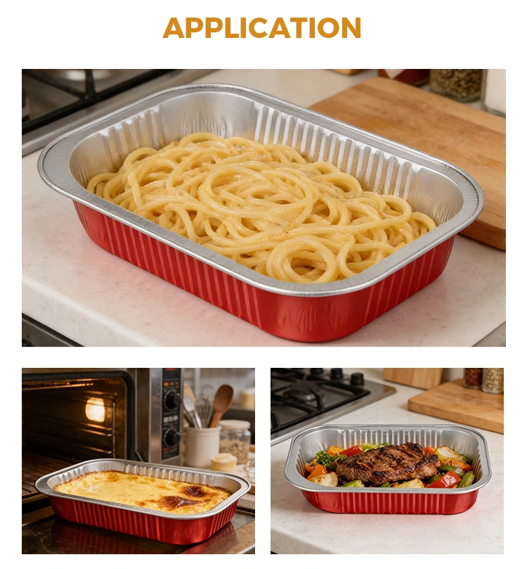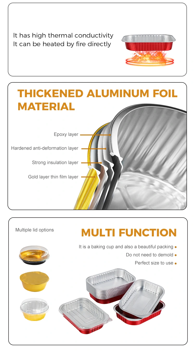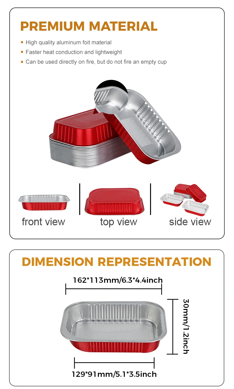செவ்வக சிவப்பு அலுமினியம் டேக் அவுட் கொள்கலனின் பொருள் உணவின் புத்துணர்ச்சியையும் புத்துணர்ச்சியையும் பூட்டலாம். அதன் சிறந்த வெப்ப கடத்துத்திறன் மற்றும் காப்பு பண்புகள் அதை நேரடியாக அடுப்பு, மைக்ரோவேவ் மற்றும் குளிர்சாதன பெட்டியில் குளிரூட்ட அனுமதிக்கின்றன, உணவின் அசல் சுவையை திறம்பட பூட்டி, நீண்ட காலத்திற்கு சிறந்த சுவையை பராமரிக்கின்றன.