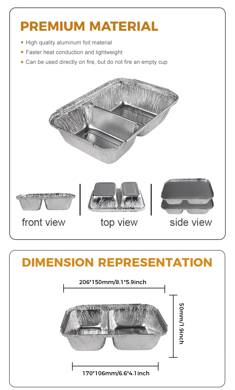 யங்கு அலுமினியத் தகடு விநியோக தொழிற்சாலையின் செலவழிப்பு பெட்டியின் துரித உணவு வெள்ளி அலுமினியத் தகடு கொள்கலன்கள் மாதிரி 75600 ஆகும், மேல் விட்டம் 206 மிமீ (8.1 அங்குலம்), 150 மிமீ (5.9 அங்குல), கீழ் விட்டம் 170 மிமீ (6.6 அங்குலம்), 106 மிமீ (4.1 அங்குல), மற்றும் உயரம் 50 மிமீ (1.9). திறன் தோராயமாக 860 மில்லி (30.3 அவுன்ஸ்). இந்த அலுமினியத் தகடு மதிய உணவுப் பெட்டியில் சிறந்த வெப்பத் தக்கவைப்பு மட்டுமல்லாமல், அலுமினியத் தகடு மூடியுடன் இணைக்கப்படலாம். கூடுதலாக, வாடிக்கையாளர் நினைவகத்தை ஆழப்படுத்தவும் பிராண்ட் விழிப்புணர்வை மேம்படுத்தவும் தனிப்பயனாக்கப்பட்ட லோகோ சேவைகளையும் நாங்கள் வழங்குகிறோம்.