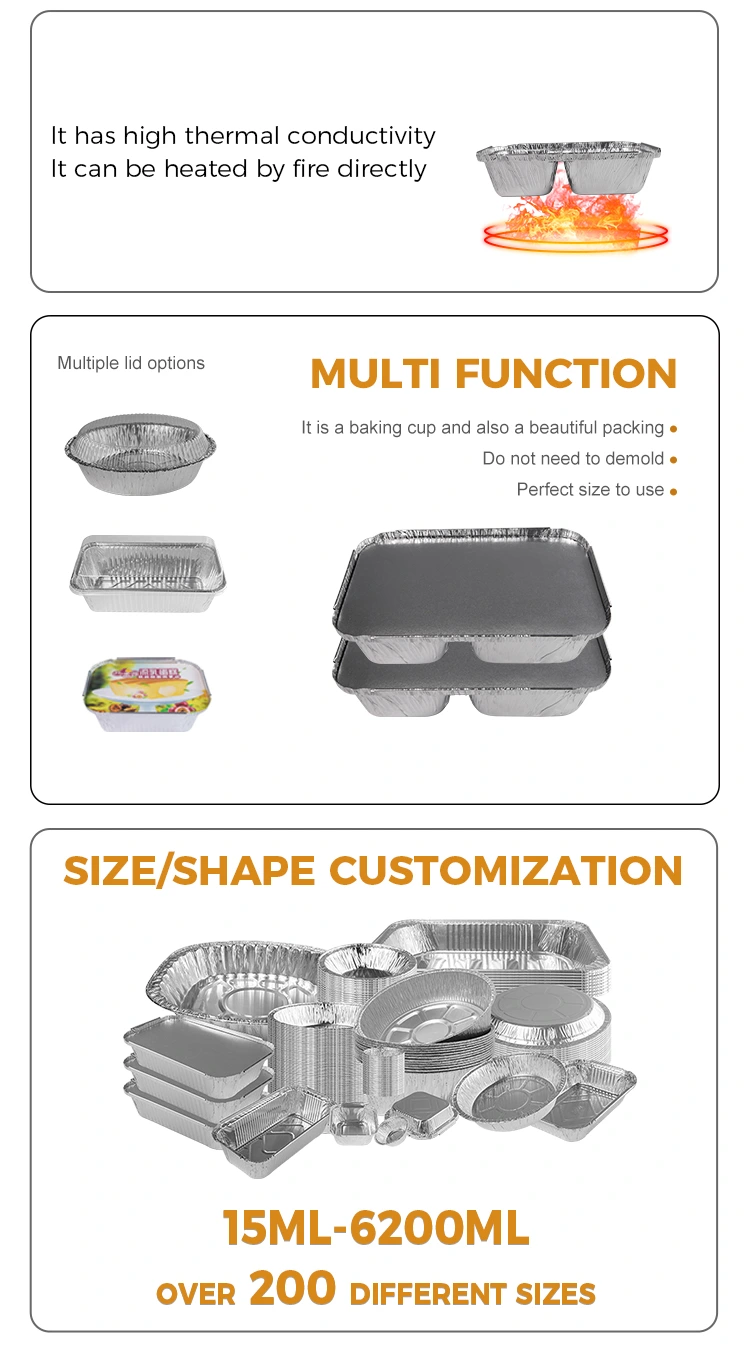 காகித மூடியுடன் கூடிய செலவழிப்பு பெட்டியின் துரித உணவு வெள்ளி அலுமினியத் தகடு கொள்கலன்கள் நல்ல வெப்பத் தக்கவைப்பைக் கொண்டுள்ளன, மேலும் உணவு வெப்பத்தை இழப்பதை மெதுவாக்கும். இலையுதிர் மற்றும் குளிர்காலத்தில், புதிதாக தயாரிக்கப்பட்ட சூடான குண்டு போன்ற சூடான உணவைப் பாதுகாப்பதில் இது ஒரு நல்ல தாக்கத்தை ஏற்படுத்துகிறது, இது ஒரு குறிப்பிட்ட காலத்திற்கு உணவின் வெப்பநிலையை பராமரிக்க முடியும், இதனால் நுகர்வோர் சாப்பிடும்போது சூடான உணவை அனுபவிக்க முடியும்.