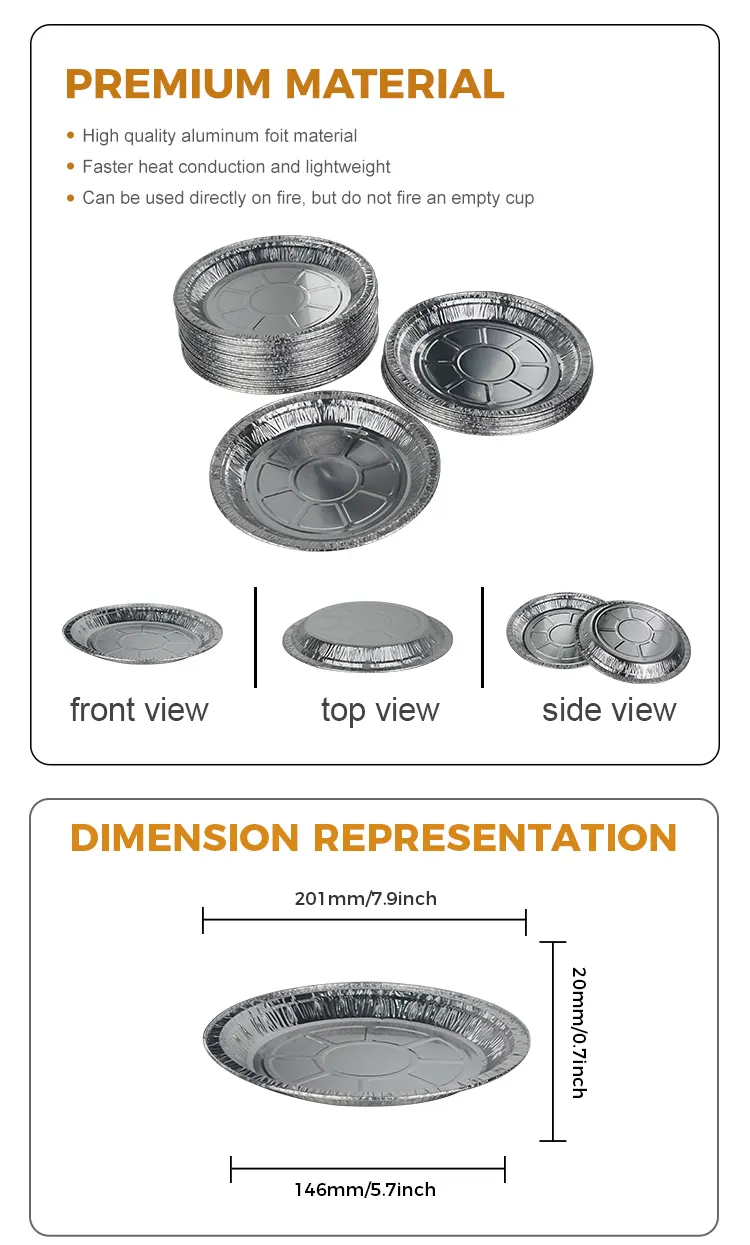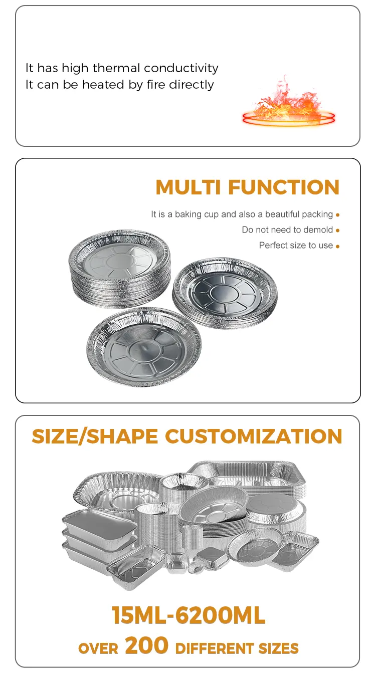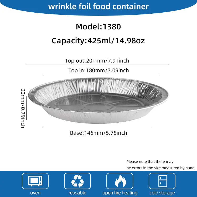 யுஞ்சு அலுமினியம் ஃபாயில் டிஸ்போசபிள் டிஸ்க் ஏர் பிரையர் சில்வர் அலுமினிய ஃபாயில் கொள்கலன் சுகாதாரமானது மற்றும் சுற்றுச்சூழலுக்கு உகந்தது. இது தடிமனான மற்றும் அரிப்பை எதிர்க்கும் பொருட்களால் ஆனது, அவை எளிதில் சிதைக்கப்படாது மற்றும் உணவுடன் நேரடியாக தொடர்பு கொள்ள முடியும். இது அதிக வெப்பநிலைக்கு பயப்படுவதில்லை, எரிக்கப்படுவதில்லை, எரிக்கப்படுவதில்லை, எளிதல்ல. இது 250 டிகிரி செல்சியஸ் வரை அதிக வெப்பநிலையைத் தாங்கும் மற்றும் அதிக வெப்பநிலை பேக்கிங், ஓவன் மற்றும் பார்பிக்யூ போன்ற பல்வேறு சமையல் முறைகளுக்கு ஏற்றது, எனவே கவலைப்படத் தேவையில்லை. பல்வேறு அளவுகளில் பன்முகப்படுத்தப்பட்ட பேக்கிங் தேவைகளைப் பூர்த்தி செய்ய பல விவரக்குறிப்புகள் உள்ளன, இது பல்வேறு உணவு உற்பத்தித் தேவைகளை எளிதில் சமாளிக்க உங்களை அனுமதிக்கிறது.