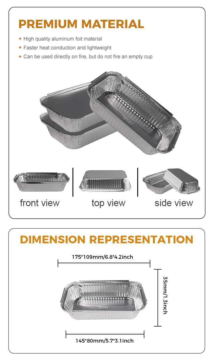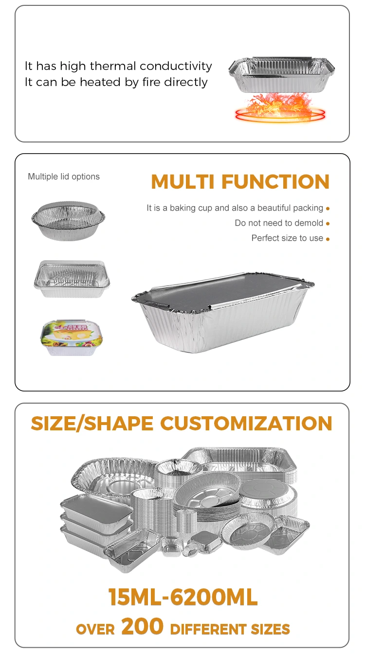 இந்த செலவழிப்பு துரித உணவு பெட்டி பார்பிக்யூ சில்வர் அலுமினியத் தகடு கொள்கலன்கள் உயர்தர 8011 அலுமினியத் தகடுப் பொருளால் ஆனவை, இது ஒரு நல்ல வெப்பப் பாதுகாப்பு விளைவைக் கொண்டுள்ளது மற்றும் உணவின் வெப்பநிலையை பராமரிக்க முடியும், இதனால் உணவை மிகவும் சுவையாகவும் சுவையாகவும் மாற்றும். கூடுதலாக, எங்கள் செவ்வக BBQ சில்வர் அலுமினியத் தகடு கொள்கலன் ஒரு வெப்ப காப்பு செயல்பாட்டைக் கொண்டுள்ளது, இது அலுமினியத் தகடு மூடி அல்லது செல்லப்பிராணி பிளாஸ்டிக் மூடியுடன் இணைக்கப்படலாம், இது தனிப்பயனாக்கப்பட்ட லோகோவுக்கு வசதியானது மற்றும் பிராண்ட் படத்தை மேலும் மேம்படுத்துகிறது.