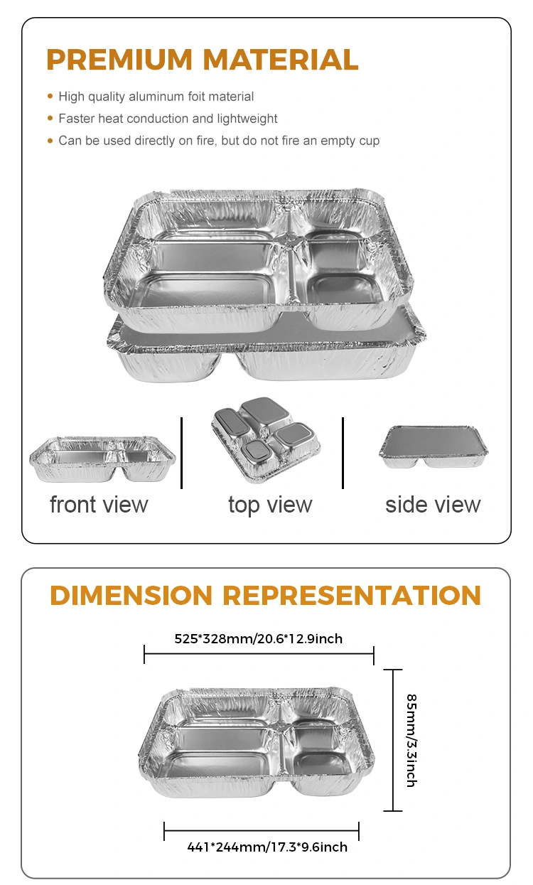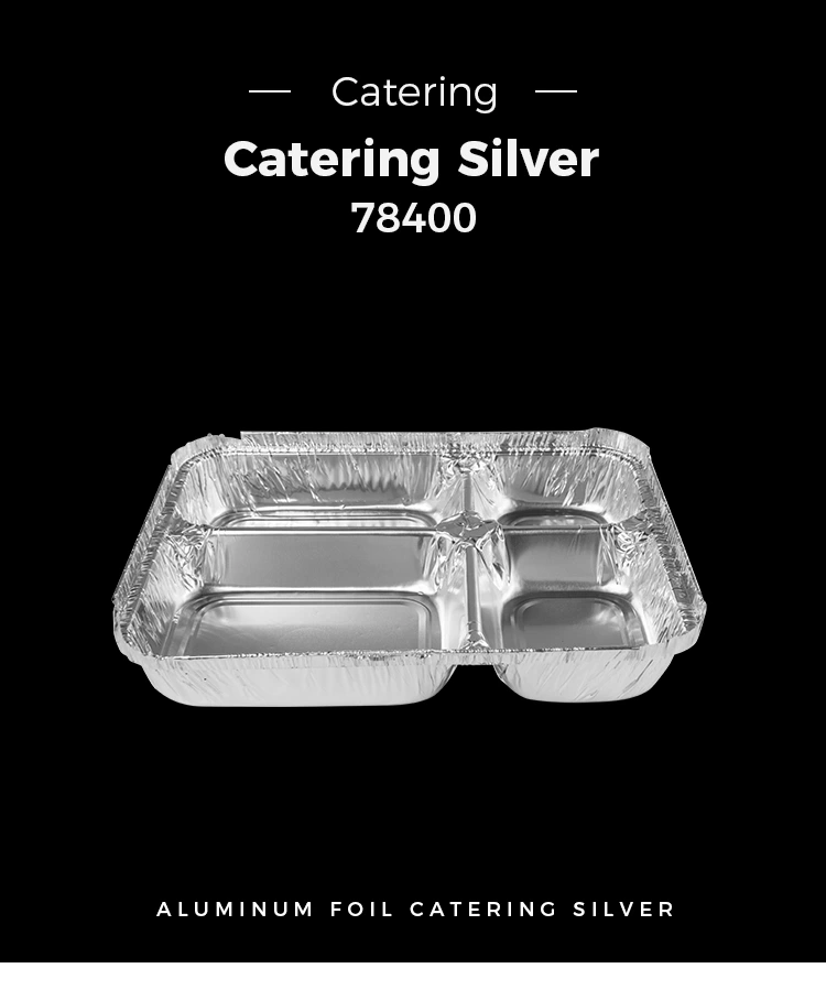 யுன்ச்சு அலுமினியத் தகடு சப்ளை தொழிற்சாலை ஒரு புதிய செலவழிப்பு பல-பெட்டிகளின் துரித உணவு சில்வர் அலுமினியத் தகடு கொள்கலன்கள், மாதிரி எண் 78400 ஐ அறிமுகப்படுத்தியது. ஏறக்குறைய 1020 மில்லி (36.0 அவுன்ஸ்) திறனுடன், நான்கு பெட்டிகளில் பலவிதமான உணவுகளை வைத்திருப்பது வசதியானது மற்றும் நடைமுறைக்குரியது.