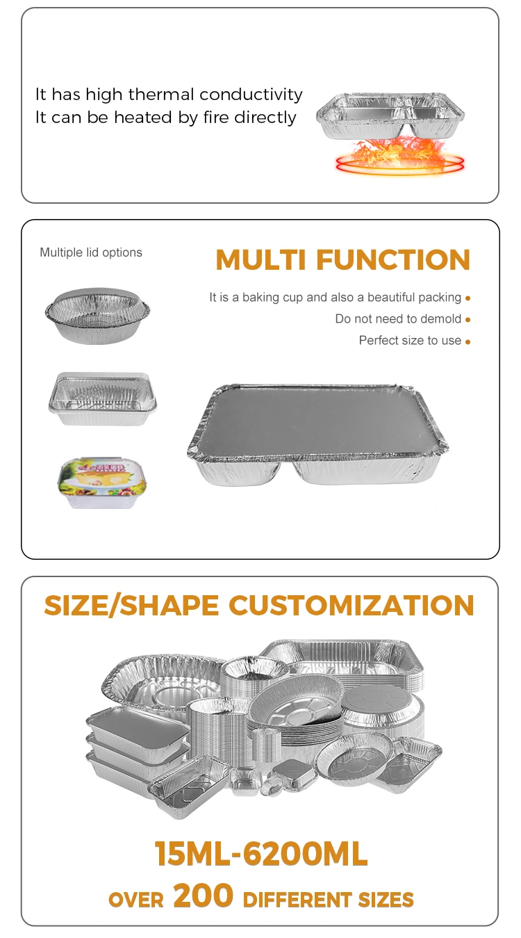 இந்த அலுமினியத் தகடு மதிய உணவுப் பெட்டியில் வெப்ப காப்பு பண்புகள் மட்டுமல்லாமல், அலுமினியத் தகடு மூடியுடன் இணைக்கப்படலாம், இது உற்பத்தியின் நடைமுறையை மேலும் மேம்படுத்துகிறது. கூடுதலாக, பிராண்ட் படத்தை மேம்படுத்தவும் வாடிக்கையாளர் நினைவக புள்ளிகளை மேம்படுத்தவும் தனிப்பயனாக்கப்பட்ட லோகோ சேவைகளையும் நாங்கள் வழங்குகிறோம்.