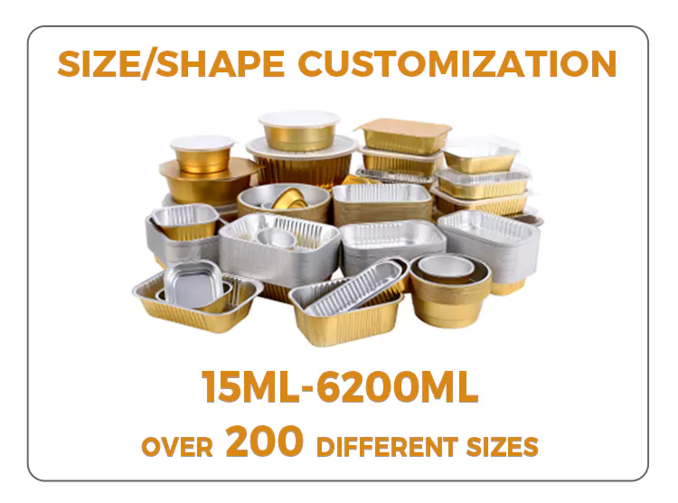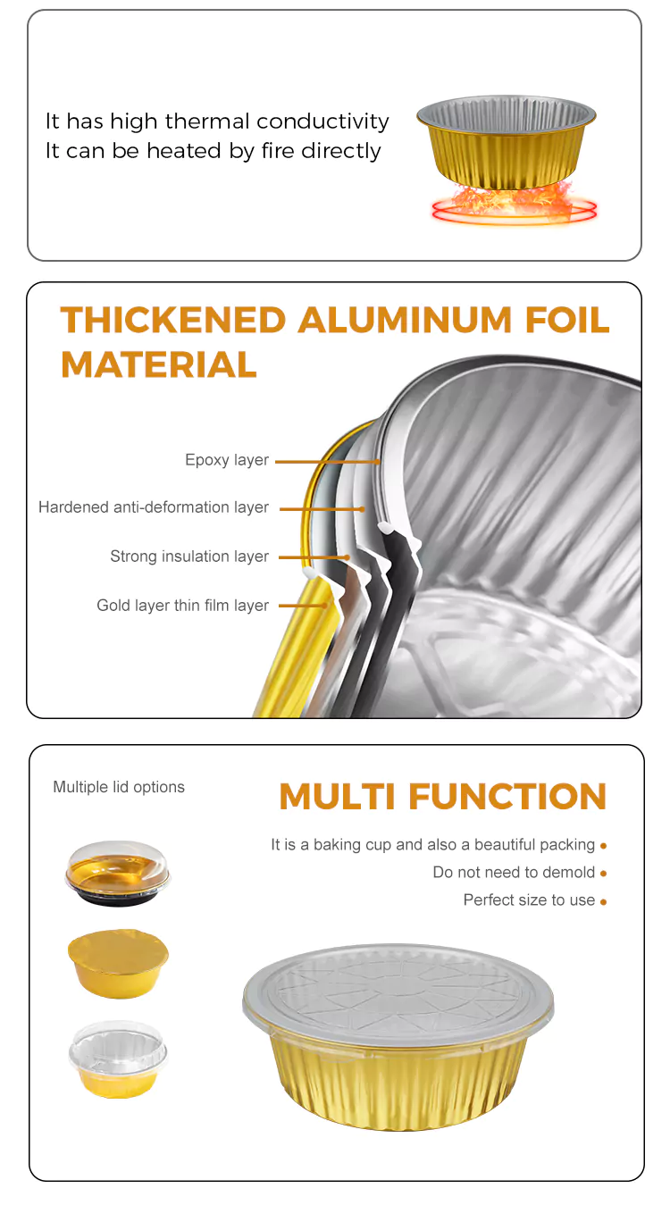 சிறந்த வெப்ப கடத்துத்திறன் செயல்திறன் என்பது டிஸ்போசபிள் சுற்று பெரிய கொள்ளளவு கொண்ட தங்க அலுமினிய ஃபாயில் கொள்கலன்களின் முக்கிய நன்மைகளில் ஒன்றாகும். அலுமினியத் தகடு வெப்பத்தை விரைவாகவும் சமமாகவும் கடத்துகிறது. அடுப்பில் சுடப்பட்டாலும், திறந்த தீயில் அல்லது மைக்ரோவேவ் அடுப்பில் சுடப்பட்டாலும், உணவு சமமாக சூடேற்றப்படுவதை உறுதிசெய்து, சமைக்கும் நேரத்தைக் குறைத்து, பொருட்களின் அசல் சுவையைத் தக்க வைத்துக் கொள்ள முடியும். சுற்று வடிவமைப்பு வெப்ப சுழற்சிக்கு மிகவும் உகந்தது. சீல் செய்யக்கூடிய அலுமினியத் தகடு அட்டையுடன் இணைக்கப்பட்டுள்ளது, இது ஈரப்பதம் இழப்பைத் தடுப்பது மட்டுமல்லாமல், ஒருங்கிணைந்த பாதுகாப்பு மற்றும் வெப்பத்தையும் அடைய முடியும். டேக்அவுட் டெலிவரியின் போது, ​​இது உணவை சூடாக வைத்திருக்க முடியும், இதனால் நுகர்வோர் எந்த நேரத்திலும் சூடான உணவை அனுபவிக்க முடியும்.