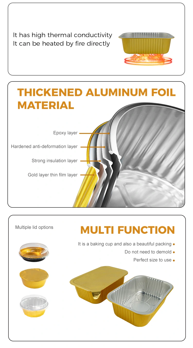 யுன்ச்சு அலுமினியத் தகடு சப்ளையர் செலவழிப்பு சதுர முத்திரை கிராடின் அலுமினியத் தகடு கொள்கலன்கள் உயர்தர உணவு தர அலுமினியத் தகடுப் பொருளால் கவனமாக தயாரிக்கப்படுகின்றன, இது அலுமினியத் தகடு சீல் மூடியுடன் பயன்படுத்தப்படலாம், இது சிறந்த சீல் செயல்திறன், அதிக வெப்பநிலை எதிர்ப்பு மற்றும் எண்ணெய் மற்றும் கசிவு எதிர்ப்பு ஆகியவற்றைக் கொண்டுள்ளது. இது உணவு பேக்கேஜிங், வெப்பமாக்கல், குளிர்பதன மற்றும் டேக்அவே டெலிவரி போன்ற பல்வேறு காட்சிகளில் பரவலாகப் பயன்படுத்தப்படுகிறது. மேற்பரப்பு ஒரு ஒளி சுவருடன் வடிவமைக்கப்பட்டுள்ளது, மேலும் தோற்றம் தட்டையானது மற்றும் மென்மையானது, இது வெப்ப சீல் படத்தின் தானியங்கி சீல் செய்வதற்கு வசதியானது, இதனால் பேக்கேஜிங் செயல்திறனை மேம்படுத்த.