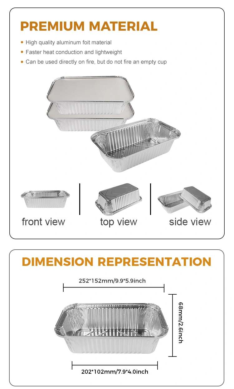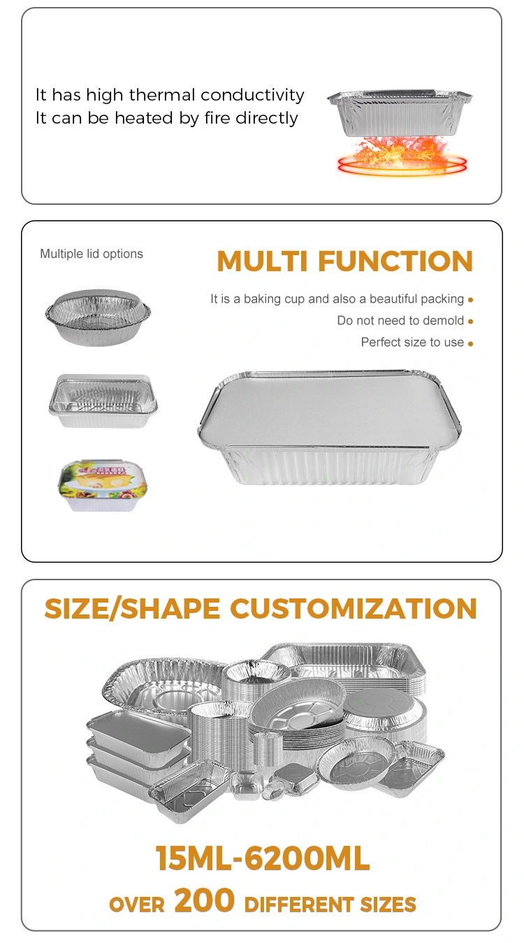 யுன்ச்சு அலுமினியத் தகடு இந்த செவ்வக ஏர் பிரையர் பேக்கிங் சில்வர் அலுமினியத் தகடு கொள்கலன்கள் உயர்தர 8011 அலுமினியத் தகடு பொருளால் ஆனவை, இது சிறந்த வெப்ப காப்பு செயல்திறனைக் கொண்டுள்ளது மற்றும் உணவின் வெப்பநிலையை திறம்பட பராமரிக்க முடியும், இதனால் உணவை மிகவும் சுவையாகவும் சுவையாகவும் மாற்றும். அதே நேரத்தில், எங்கள் செவ்வக BBQ வெள்ளி அலுமினியத் தகடு கொள்கலனும் வெப்ப பாதுகாப்பு செயல்பாட்டைக் கொண்டுள்ளது, இது ஒரு அலுமினியத் தகடு மூடி அல்லது செல்லப்பிராணி பிளாஸ்டிக் மூடியுடன் பொருந்துவதன் மூலம் அடைய முடியும், இது தனிப்பயனாக்கப்பட்ட லோகோவுக்கு வசதியானது, இதனால் பிராண்ட் படத்தை மேம்படுத்துகிறது.