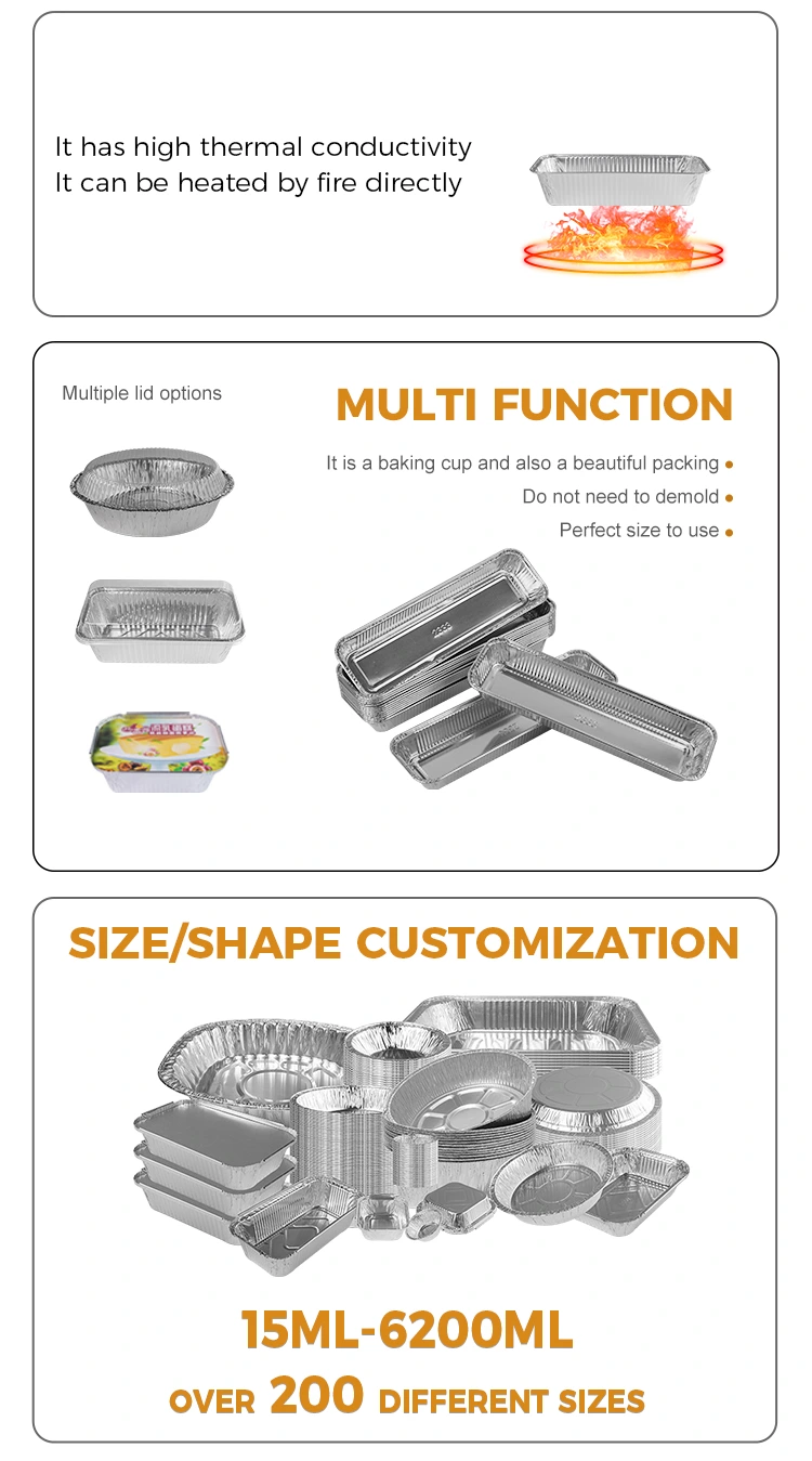 அம்சங்கள்: மதிய உணவு பெட்டி மொத்தம் 8011 அலுமினியத் தகடு பொருளால் ஆனது, இது ஒரு நல்ல வெப்ப பாதுகாப்பு விளைவைக் கொண்டுள்ளது மற்றும் உணவின் வெப்பநிலையை பராமரிக்க முடியும், இதனால் உணவை மிகவும் சுவையாகவும் சுவையாகவும் மாற்றும். கூடுதலாக, எங்கள் செவ்வக BBQ சில்வர் அலுமினியத் தகடு கொள்கலனும் ஒரு வெப்ப காப்பு செயல்பாட்டைக் கொண்டுள்ளது மற்றும் அலுமினியத் தகடு மூடி மற்றும் செல்லப்பிராணி பிளாஸ்டிக் மூடி ஆகியவற்றுடன் பொருந்தலாம்.