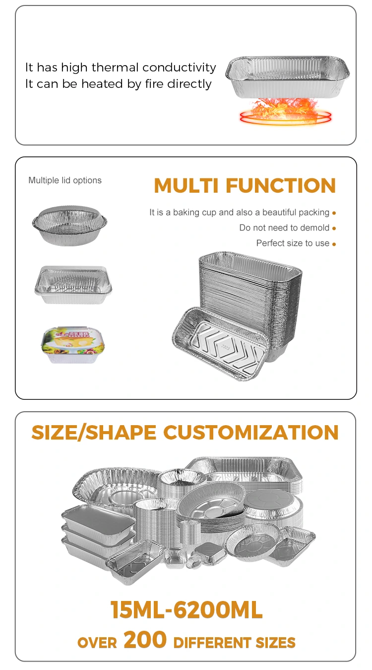 அம்சங்கள்: மதிய உணவு பெட்டி மொத்தம் 8011 அலுமினியத் தகடு பொருள் நல்ல வெப்பப் பாதுகாப்பால் ஆனது, இது உணவின் வெப்பநிலையை பராமரிக்கலாம் மற்றும் உணவை மிகவும் சுவையாக மாற்றும். கூடுதலாக, எங்கள் செவ்வக பார்பிக்யூ சில்வர் அலுமினியத் தகடு கொள்கலனில் வெப்ப பாதுகாப்பு செயல்பாடு உள்ளது, இது அலுமினியத் தகடு காகித மூடி மற்றும் செல்லப்பிராணி பிளாஸ்டிக் மூடி ஆகியவற்றுடன் பொருந்தலாம், இது உங்கள் லோகோவைத் தனிப்பயனாக்கவும், வாடிக்கையாளர் தோற்றத்தை மேலும் ஆழப்படுத்தவும், உங்கள் பிராண்ட் படத்தை மேம்படுத்தவும் வசதியானது.