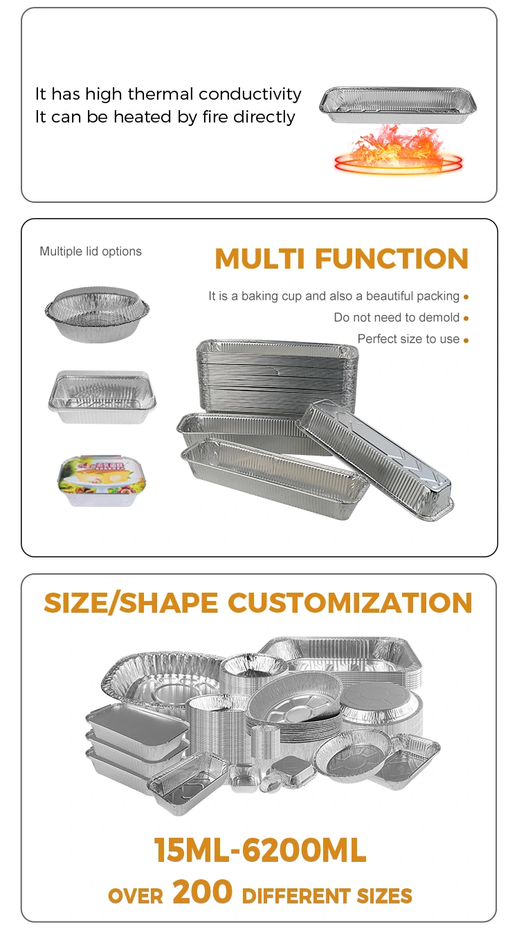 இந்த செவ்வக ரொட்டி தட்டு பேக்கிங் வெள்ளி அலுமினியத் தகடு கொள்கலன்கள் திறந்த சுடர் வெப்பமாக்கலின் போது தீங்கு விளைவிக்கும் பொருட்கள் எதுவும் வெளியிடப்படுவதை உறுதிசெய்ய கடுமையான தரமான சோதனைக்கு உட்படுகின்றன, மேலும் பயனர்கள் பாதுகாப்பு சிக்கல்களைப் பற்றி கவலைப்பட தேவையில்லை. கூடுதலாக, அதன் சூழல் நட்பு மற்றும் நீடித்த வடிவமைப்பு தயாரிப்புகளின் பாதுகாப்பான போக்குவரத்தை உறுதி செய்வதோடு மட்டுமல்லாமல், சிறந்த தோற்றத்தையும் பராமரிக்கிறது. கீழே உள்ள குழிவான மற்றும் குவிந்த வடிவமைப்பு உற்பத்தியின்-சீட்டு எதிர்ப்பு பண்புகளை மேம்படுத்துகிறது, அதே நேரத்தில் பக்கங்களில் சேர்க்கப்பட்ட விறைப்பான்கள் உற்பத்தியின் கடினத்தன்மையை அதிகரிக்கின்றன. நல்ல உயர் வெப்பநிலை எதிர்ப்பு மற்றும் வெப்ப கடத்துத்திறன் கொண்ட ஹெம்மிங் வடிவமைப்பு தடிமனாகவும் ஆழமாகவும் உள்ளது, இது சீரான வெப்பமாக்கல் மற்றும் விசித்திரமான வாசனையை அடைய முடியும், இது கரி கிரில்லிங், நீண்ட ரொட்டி மற்றும் டேக்அவே டெலிவரி போன்ற பல காட்சிகளில் பயன்படுத்த மிகவும் பொருத்தமானது.