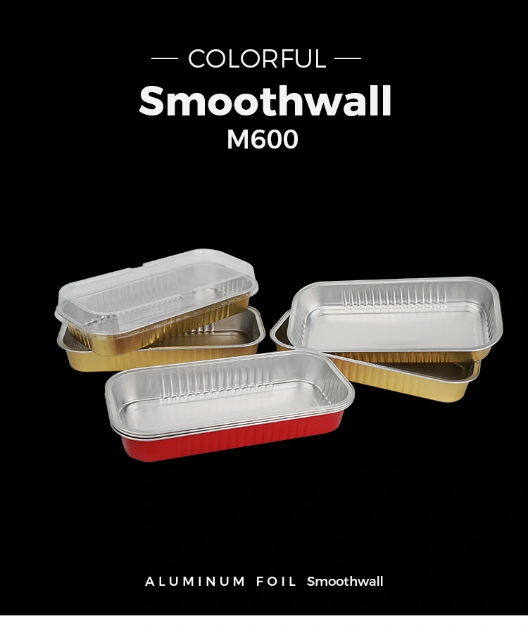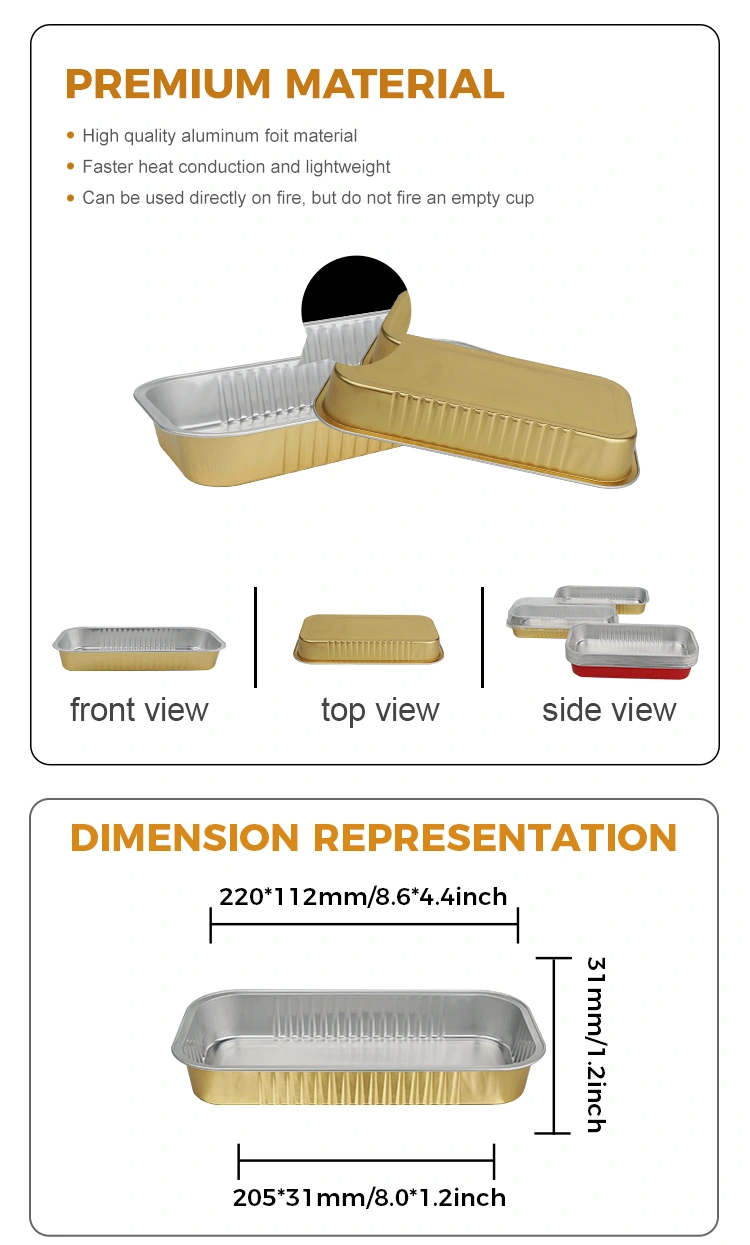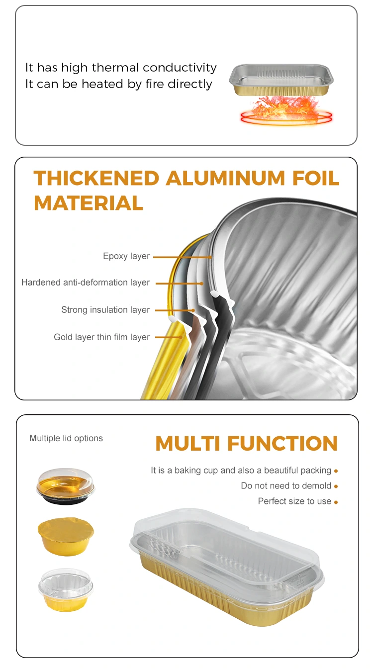அலுமினியத் தகடு பொருளின் சிறந்த வெப்ப கடத்துத்திறன் அடுப்பு வெப்பத்தை விரைவாகவும் சமமாகவும் உணவின் உட்புறத்திற்கு மாற்ற அனுமதிக்கிறது, உள்ளூர் எரியும் அல்லது சாண்ட்விச்சிங் சிக்கல்களைத் தவிர்க்கிறது. நீண்ட பேஸ்ட்ரிகளை சுடும்போது, ​​பெட்டியின் உடல் உணவின் வடிவத்துடன் நெருக்கமாக பொருந்துகிறது, ஈரப்பதம் மற்றும் நறுமணத்தில் பூட்டுகிறது. சுடும்போது வெளியில் மிருதுவாகவும், உட்புறம் மென்மையாகவும் இருக்கும். சாதாரண கண்ணாடி அல்லது பிளாஸ்டிக் கொள்கலன்களை விட சுவை மிகவும் சிறந்தது. பெட்டியின் விளிம்புகள் வட்டமானது, இது கீறல்-எதிர்ப்பு மற்றும் திறம்பட சூப் கசிவைத் தடுக்கிறது. செவ்வக கோல்டன் பேக் ஸ்மூத்வால் அலுமினியம் ஃபாயில் கன்டெய்னர்கள் சாஸ்கள் (லாவா சாக்லேட் பார்கள், கேரமல் நட் ரோல்ஸ் போன்றவை) சுடப்பட்ட சுவையான உணவுகளுக்கு ஏற்றது.