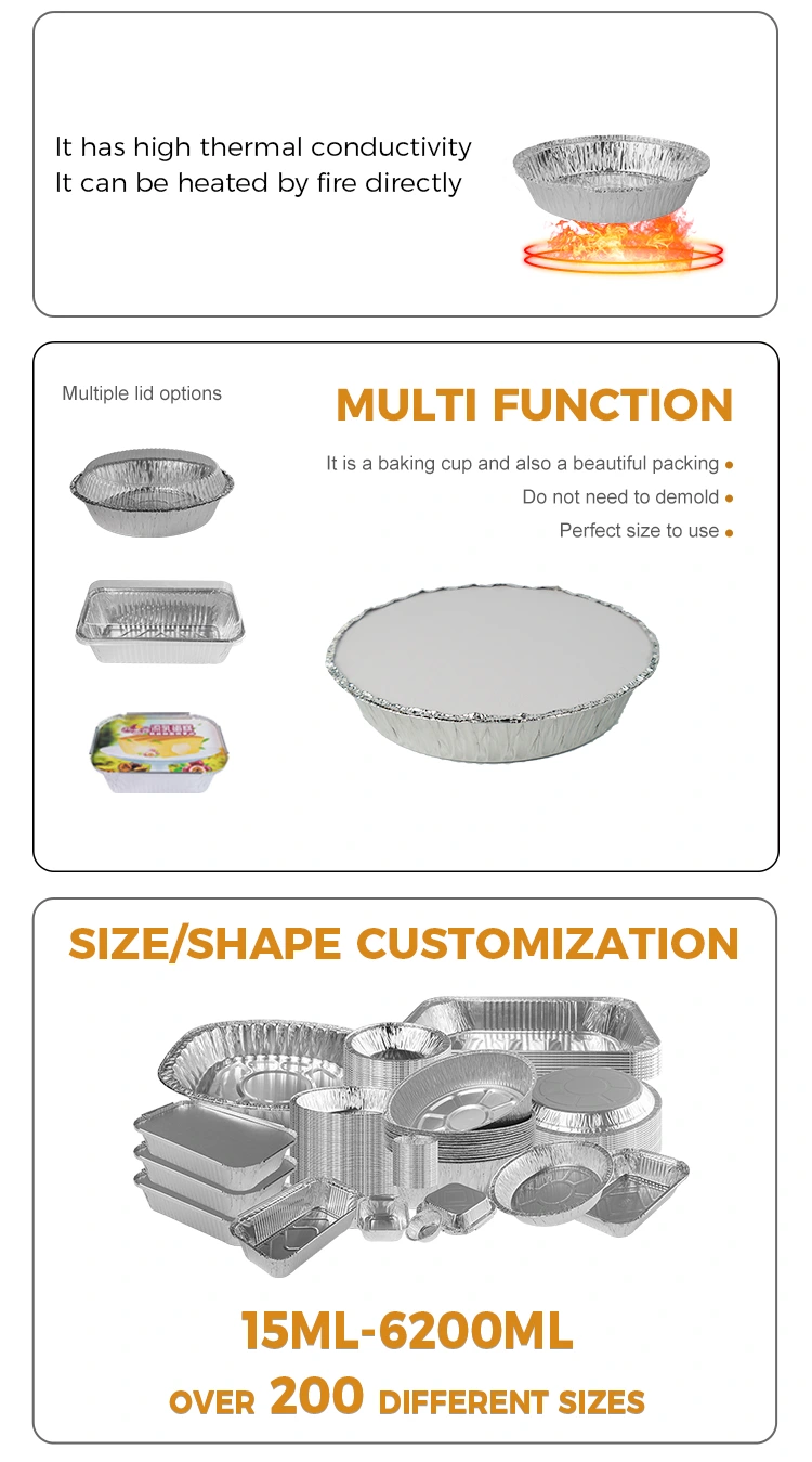 அம்சங்கள்: ஒரு-துண்டு மோல்டிங் தடிமனான மற்றும் வேகவைத்த-எதிர்ப்பு, உணவு தொடர்பு தர அலுமினியத் தகடு பொருளை ஏற்றுக்கொள்வது, உணவைத் தொடர்புகொள்வதற்கு உறுதியானது, சிதைப்பது எளிதல்ல, கசிவு அல்ல, வலுவான தடிமன், அரிப்பு எதிர்ப்பு, அதிக வெப்பநிலை எதிர்ப்பு.