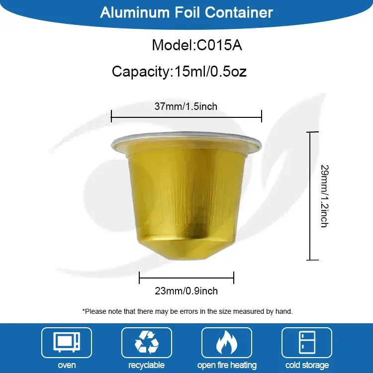 யங்கு அலுமினியத் தகடு சப்ளையர் சிலிகான்-சீல் வெற்று காபி காப்ஸ்யூல் C015A பின்வரும் அளவுகளில்: மேல் விட்டம் 37 மிமீ (சுமார் 1.4 அங்குலங்கள்), அடிப்படை விட்டம் 23 மிமீ (சுமார் 0.9 அங்குலங்கள்), உயரம் 29 மிமீ (சுமார் 1.1 அங்குலங்கள்). இந்த காப்ஸ்யூல் 15 மில்லி (சுமார் 0.5 அவுன்ஸ்) தரையில் காபி, காபி திரவத்தை வைத்திருக்கிறது. அனைத்து நெஸ்பிரெசோ இயந்திரங்களுக்கும் ஏற்றது, தொகுக்கப்பட்ட எஸ்பிரெசோ திரவம், மற்றும் நைட்ரஜன் கழுவுதலுடன் கூட நீட்டிக்கப்படலாம். கூடுதலாக, லோகோ மற்றும் வண்ணத்தையும் தனிப்பயனாக்கலாம், மேலும் அலுமினியத் தகடு அட்டையில் வடிவத்தை அச்சிடலாம், மேலும் லோகோவும் காபி காப்ஸ்யூலின் அடிப்பகுதியில் முத்திரையிடப்படலாம்.