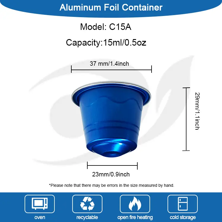 யுன்ச்சு அலுமினியத் தகடு சப்ளையர்கள் பெரும்பாலான காபி காப்ஸ்யூல் இயந்திரங்களுக்கு ஏற்ற சி 15 ஏ கூம்பு சிலிகான்-சீல்-இலவச வெற்று காபி காப்ஸ்யூலை வழங்குகிறார்கள், இது எஸ்பிரெசோ திரவத்தை தொகுக்கப் பயன்படுகிறது, மேலும் நைட்ரஜன் ஃப்ளஷிங் மூலம் அடுக்கு ஆயுளை நீட்டிக்கலாம். கூடுதலாக, லோகோ மற்றும் வண்ணங்கள் தனிப்பயனாக்கப்படலாம், மேலும் அலுமினியத் தகடு முத்திரையில் வடிவங்களை அச்சிடலாம், மேலும் லோகோ ஸ்டாம்பிங் காபி காப்ஸ்யூலின் அடிப்பகுதியில் செய்யப்படலாம். காப்ஸ்யூல் பரிமாணங்கள் பின்வருமாறு: மேல் விட்டம் 37 மிமீ (தோராயமாக 1.4 அங்குலங்கள்), அடிப்படை விட்டம் 23 மிமீ (தோராயமாக 0.9 அங்குலங்கள்), உயரம் 29 மிமீ (தோராயமாக 1.1 அங்குலங்கள்).