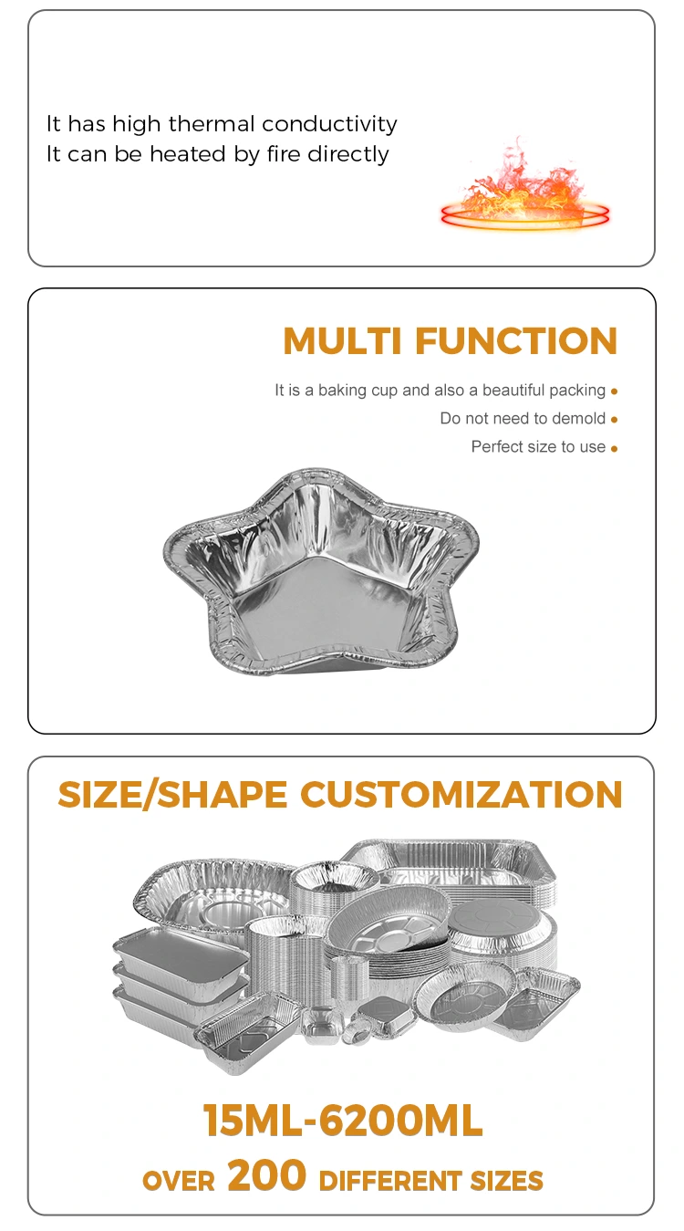 யுஞ்சு அலுமினியம் ஃபாயில் சப்ளையர் அலுமினிய ஃபாயில் உணவுக் கொள்கலன் பேக்கிங்கிற்கான நட்சத்திர வடிவ அலுமினிய ஃபாயில் டார்ட் கோப்பைகள், கெட்டியான அலுமினிய ஃபாயில் டின் டார்ட் அச்சு, நிலையான வடிவத்துடன், உணவு தர அலுமினியத் தகடு பொருட்களால் ஆனது, பேக்கிங்கிற்குப் பிறகு சிதைப்பதை எளிதாக்குகிறது. இந்த நட்சத்திர வடிவ அலுமினிய ஃபாயில் டார்ட் கப், பேக்கிங் அலுமினிய ஃபாயில் ஃபுட் கன்டெய்னர் அதிக வெப்பநிலையை எதிர்க்கும், எரிக்க அல்லது ஒட்டுவதற்கு எளிதானது அல்ல, வடிவமைக்கப்பட்ட மற்றும் பதப்படுத்தப்பட்ட அடிப்பகுதி மற்றும் விளிம்புகளுடன் சமமான வெப்ப கடத்துத்திறன், தடிமனான மற்றும் வலுவூட்டப்பட்ட ஒருங்கிணைந்த மோல்டிங், பொதுவாக காற்று வறுத்தல், வேகவைத்தல், பேக்கிங் போன்றவற்றுக்கு பயன்படுத்தப்படுகிறது.